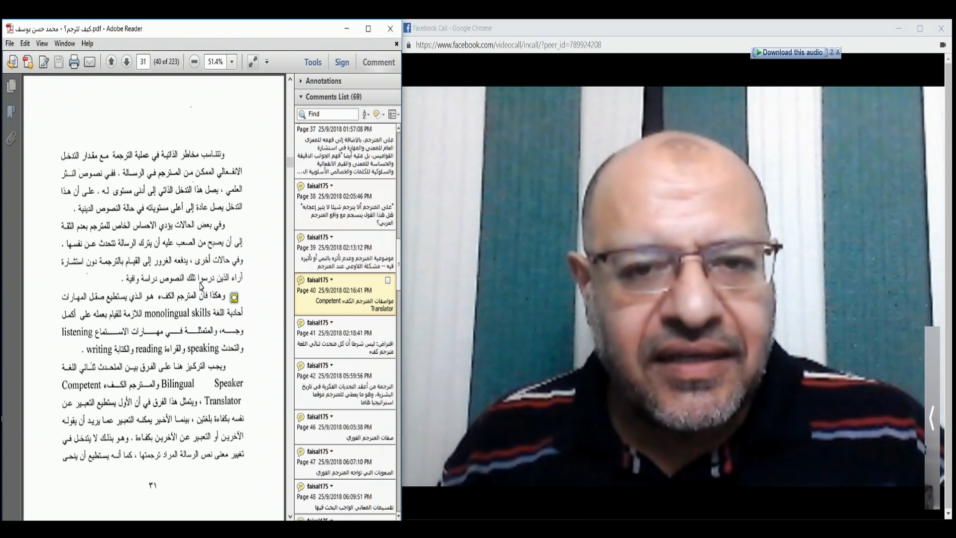 كيف تترجم.mp4_snapshot_00.57.54.375 Published 7 أكتوبر,2018 at 1920 × 1080 in لقاء مع مؤلف كتاب ( كيف تترجم ) د. محمد حسن يوسف |حاوره حول أبرز أفكار الكتاب وقضايا الترجمة وشؤونها، فيصل كريم الظفيري → السابق التالي ← شارك هذا الموضوع:المزيد إرسال رابط بالبريد الإلكتروني إلى صديق (فتح في نافذة جديدة) البريد الإلكتروني المشاركة على X (فتح في نافذة جديدة) X شارك على فيس بوك (فتح في نافذة جديدة) فيس بوك المشاركة على WhatsApp (فتح في نافذة جديدة) WhatsApp إعجاب تحميل...