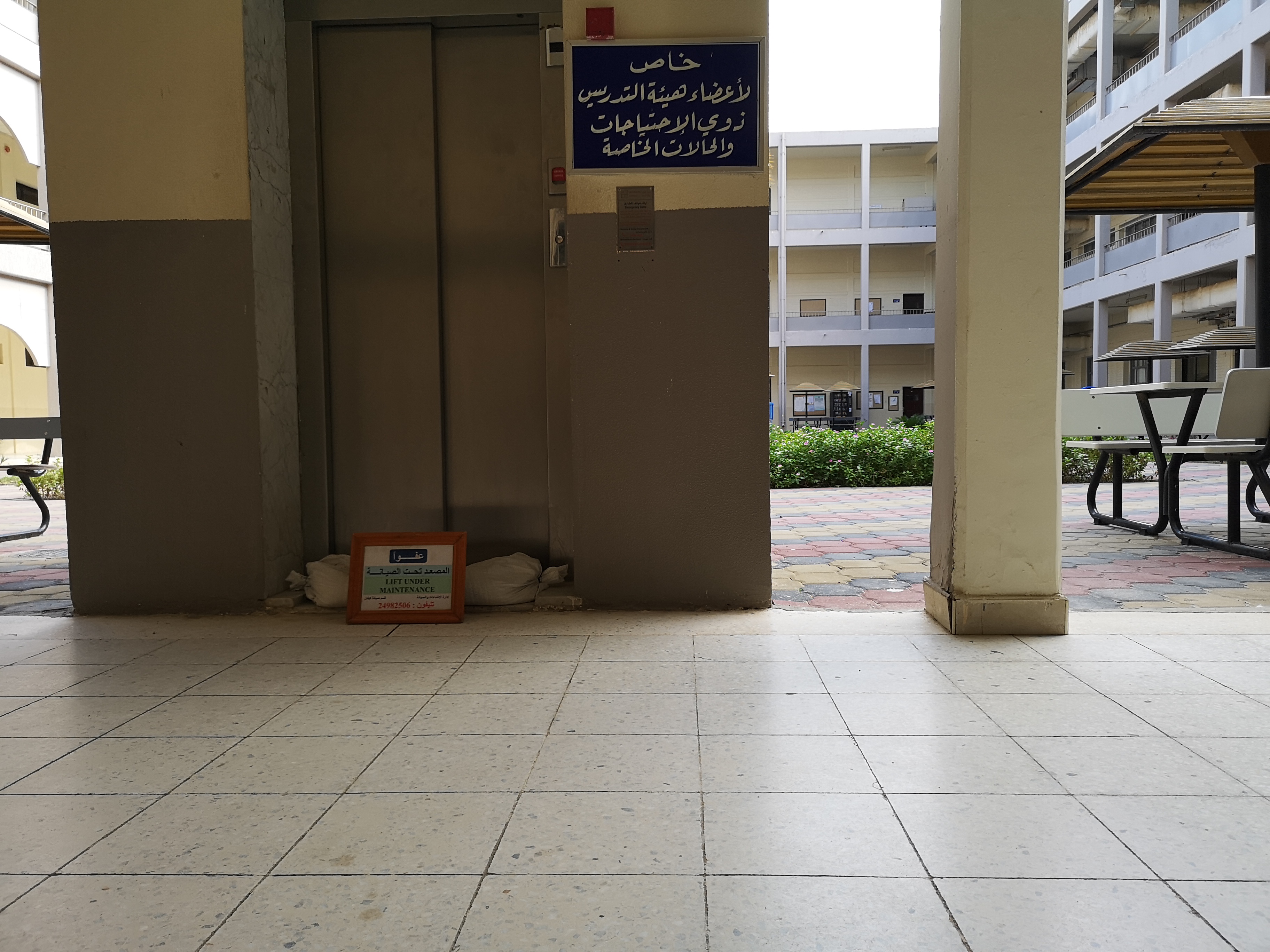 مازال المصعد الكهربائي على حاله منذ عشرين سنة. فقط أضافوا هذه العبارة بجانبه للتنبيه. طبعا بعدي وضعوا هذه العبارة منعا للتزاحم عند المصعد الضيق أصلا
